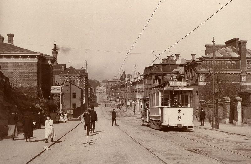 Sträckningsbild av Karl Johansgatan mot öster från Karl Johanskyrkan. Nuvarande Nordgården t.v. Längre ner t.v. Bryggeriet Kronan.