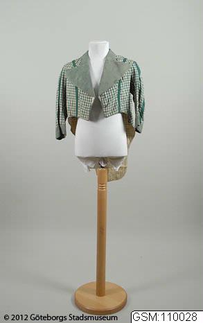 Grönrutig jacka med skört, tillhörande byxor i samma material, båda av enkel tuskaftad bomull.