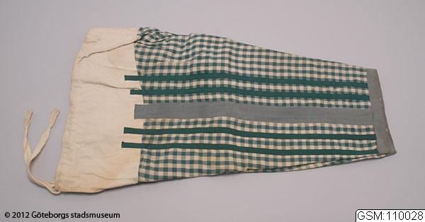 Grönrutig jacka med skört, tillhörande byxor i samma material, båda av enkel tuskaftad bomull.