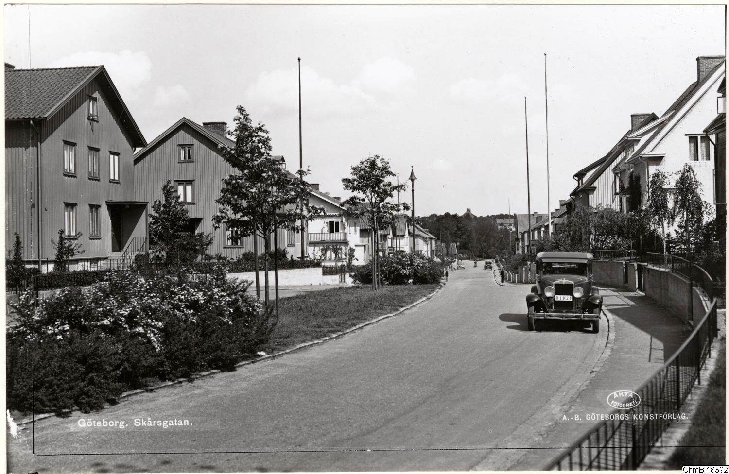 Skårsgatan, sträckningsbild. Fotografiet taget ca 1935-39. Vykort utgivet av Göteborgs konstförlag.
