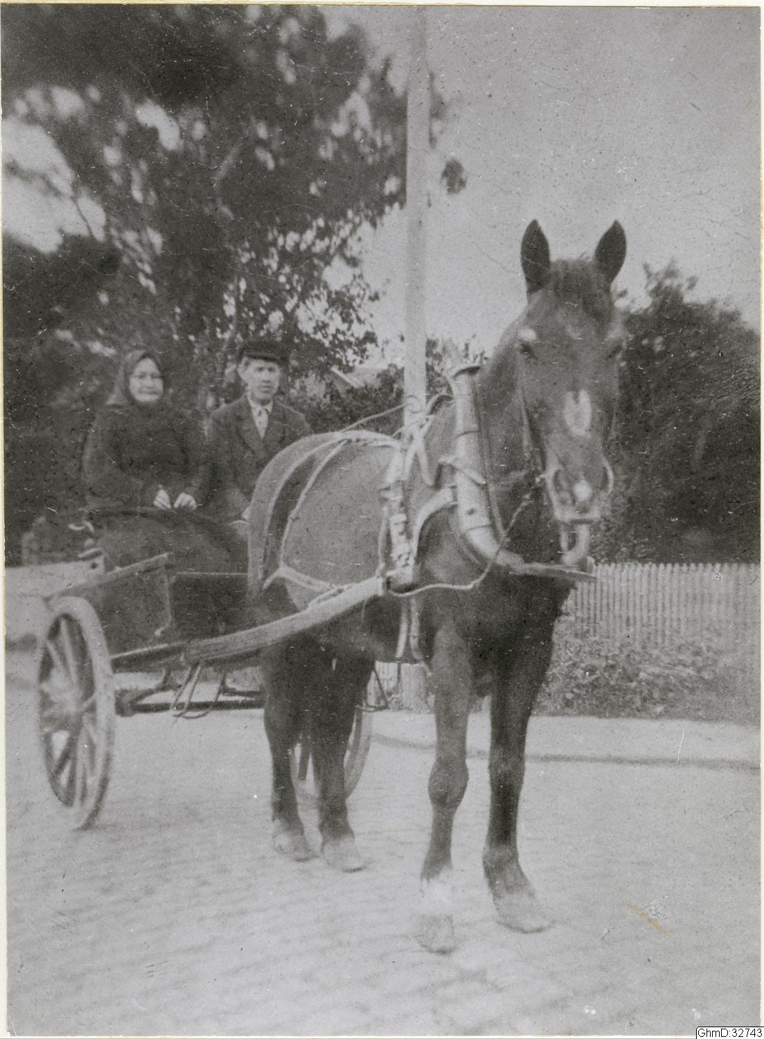 Alida Svensson och sonen Algot Adler kör med mjölk till några hushåll i Landala. Tvår gånger i veckan, körde de från Önnered med häst och vagn och passerade stadsgränsen och vidare längs Karl Johansgatan.