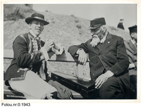 C.G. Dahl och "Gubben Dufva" (spelgubbe från Göteborg) vid Villabrons brygga.