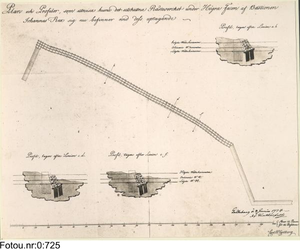 plan och profil till rustverket under Johannes Dux (eller Rex?) högra fas, upprättad av kaptenen vid Fortifikationen Carl Wilhelm Carlberg år 1774.