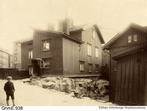 Johannes Kyrkogata 10, Majornas 5:E rote, nr 65, "Spökhuset", sett från sydost från Skepparegatan. T.h. Majornas 5:e rote, nr 60 A och B