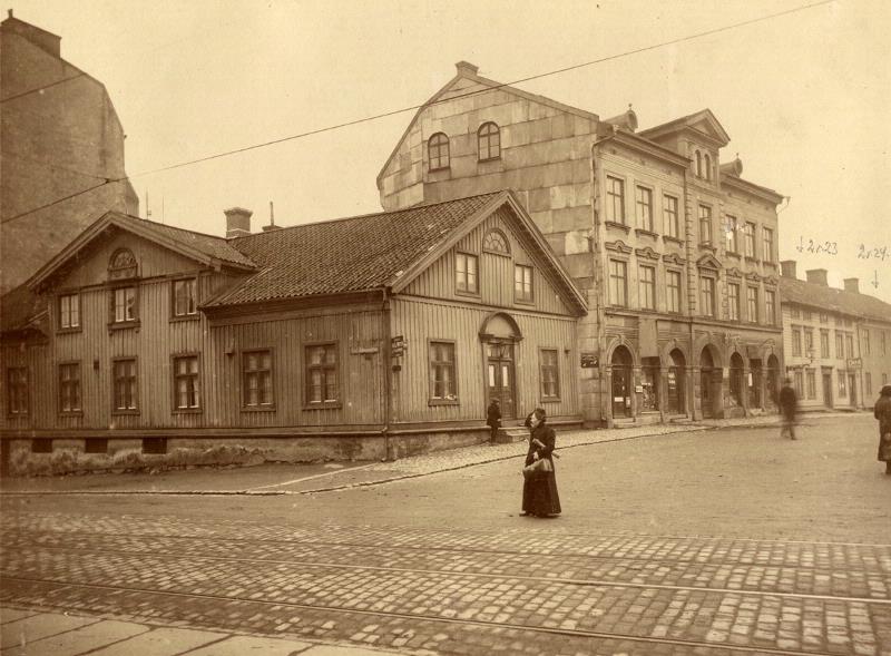 Karl Johansgatan 55 vid hörnet av Kusttorget. Skylten på hörnet tillhör Lina Bergmans servering av vin, öl, porter och kolsyrade drycker.