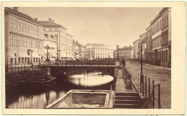 Fotot visar Östra Hamnkanalen mot söder med Stora teatern i fonden. På ömse sidor kanalen och gatan ligger fastigheter med bostäder och butik/kontor.