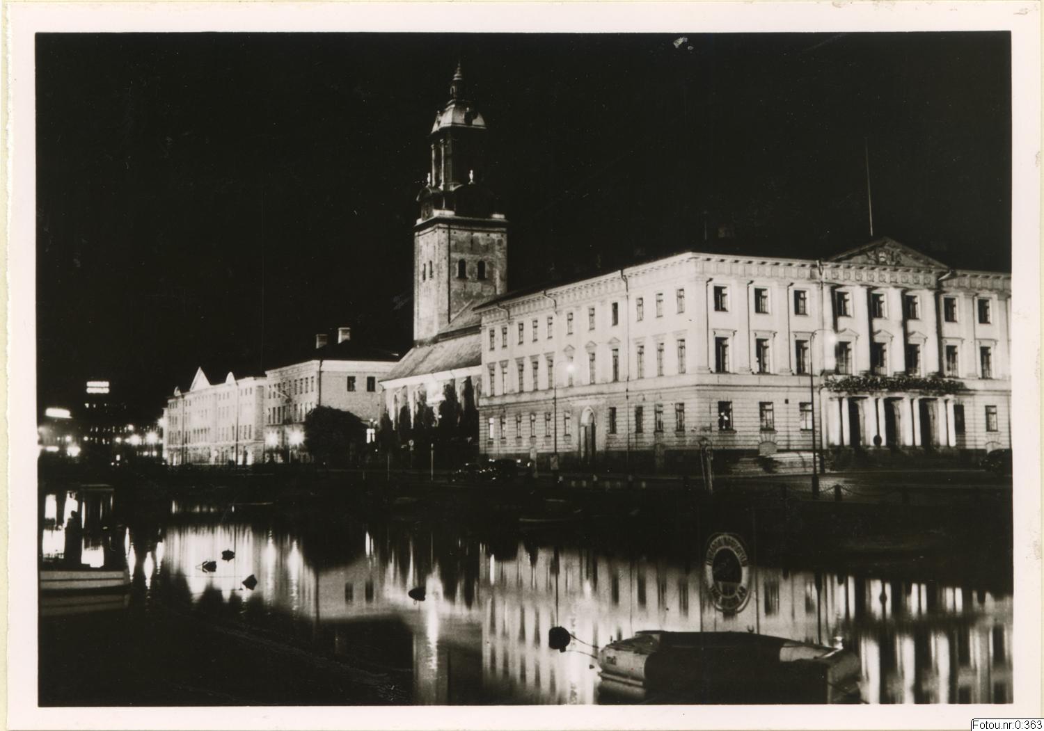 Sträckningsbild mot väster längs Stora Hamnkanalen och Norra Hamngatan med första försöket med fasadbelysning på sträckan från Rådhuset till Göteborgs Museum.
