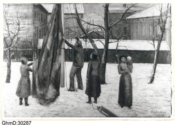 Flaggan hissas på Silvanderska Slöjdskolans gård. Oljemålning, 117 x 83 (höjd).
