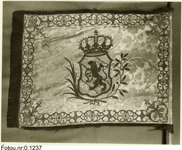 Fana, Borgerskapets i Göteborgs militärkår. Vitt fasonerat siden med broderier i färger, silke, guld- och silvertråd, i mitten Göteborgs vapen; duken kantad med guldfrans, 79 X 93 cm. Standarstång med stympad konisk spets.