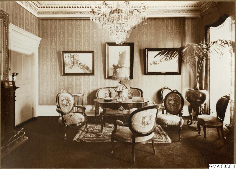 Bilden ur album från Emil Haglunds hem. Interiörbild med bord med 3 karmstolar, soffa och bord, nyrokoko, stor takkrona och stor palm i kruka vid förnstret.