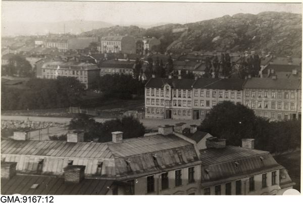 Odat. foto, omkr. 1900? Blick över hustak vid Oljekvarnsgatan mot husräcka vid Djurgårdsgatan t.h. m.m.