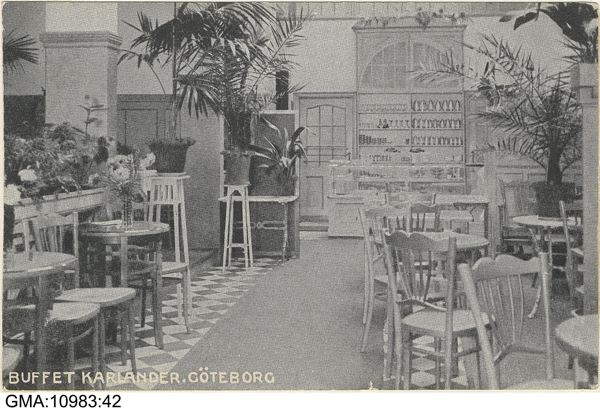 Bild av Grand Hotel Haglunds "Buffet Karlander". Inredning i Jugendstil med korgmöbler, böjträstolar, gjutjärnsbord och palmer på vita piedestaler.
