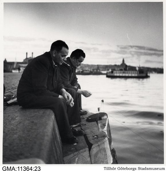 Göteborgs hamn: fiskande karlar vid tullhuset, omkring 1947.
