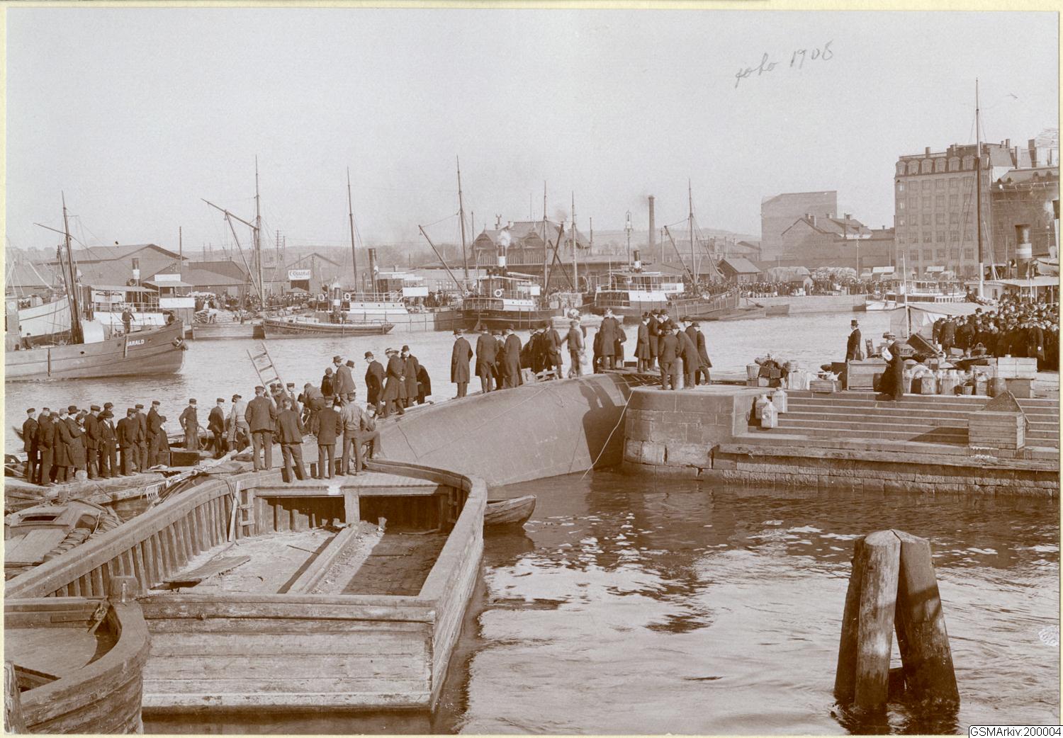 Ångare Göta Elf kantrar i Lilla Bommens hamn 15 april 1908. Olyckan berodde på felaktig lastning, godset låg på övre däck och lastrummet var i det närmaste tomma. 26 personer omkom och de flesta av dem satt i aktersalongen på undre däck.