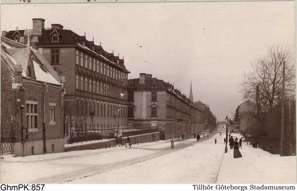 Vegagatan, parti mot norr. Närmast till vänster nr 55, portvaktsbostaden till ålderdomshemmet vid Slottsskogen. Därefter på samma sida följer fastigheten nr 51-53 och därefter nr 49, 47, o.s.v.