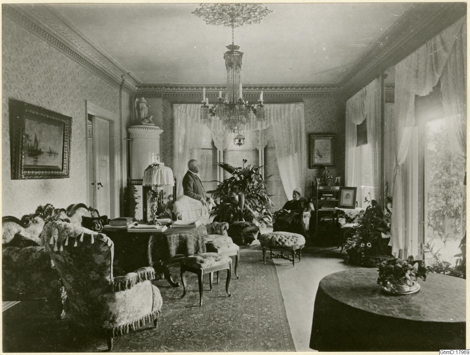 Salong i Villa Odinslund, Prospect Hill. Personerna på bilden är okända