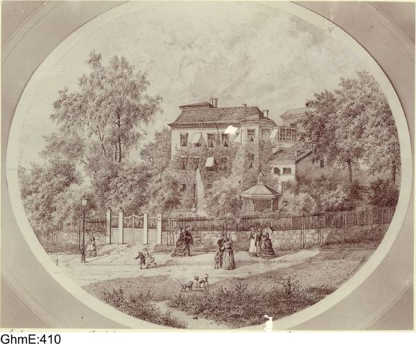 Kungsgatan 8, Lindgrenska villan. 1860-talet. Teckning av Ludvig Messmann.