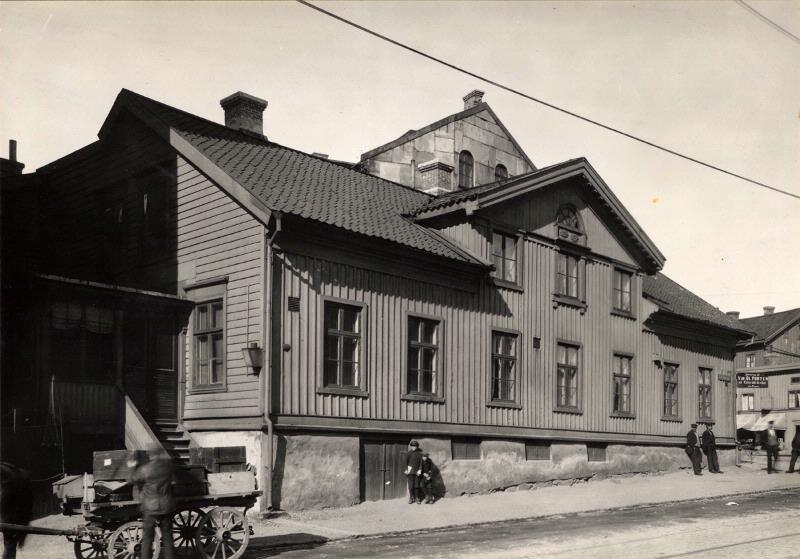 Karl Johansgatan 55 vid hörnet av Kusttorget. Skylten på hörnet tillhör Lina Bergmans servering av vin, öl, porter och kolsyrade drycker.