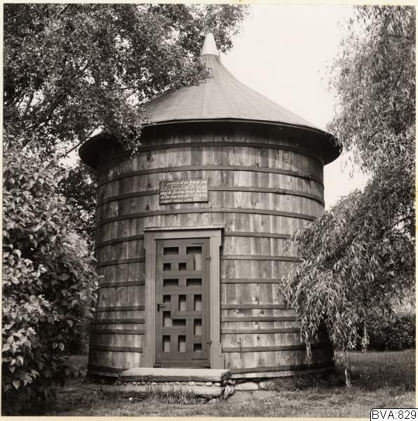 Fotografiet visar ett äldre portekar från Lorentska brukets tid. Ovanför dörren sitter en minnestext "Till åminnelse af den frukost som H M Konung Carl XIV Johan intog i det Lorentska Brukets store Vat vid Dess höga besök uthi Götheborg i augusti månad anno 1820"