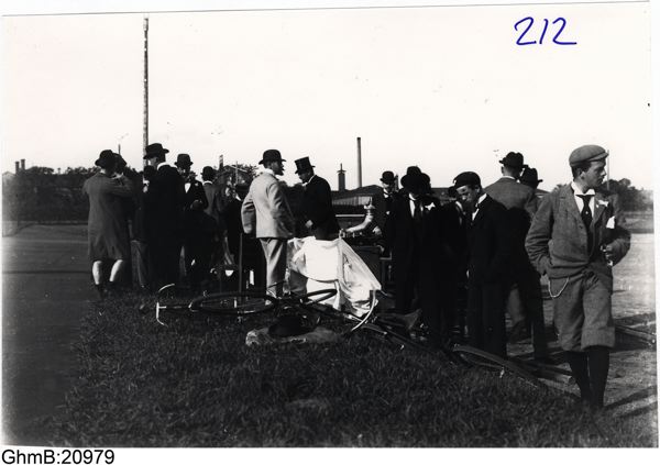 Foto från KFUM:s velocipedlopp i Slottsskogen d. 7/8 1902. Denna bild från starten på Idrottsplatsen vid Tegelbruksängen.