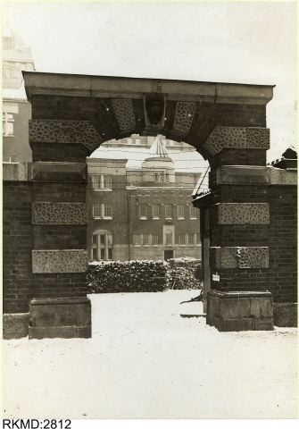 En del emblem, formstenar, delar av portaler mm. som ingått i kasernbyggnaden, blevo infogade uti telegrafstationens byggnad som delvis togs i bruk 1911