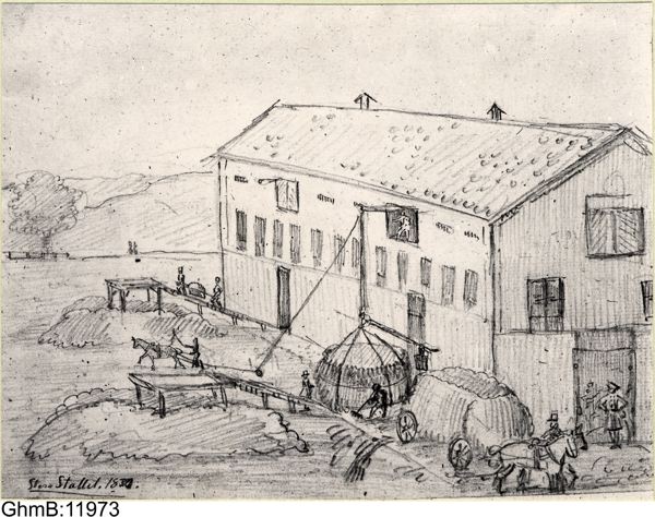 "Stora stallet 1832". Pennteckningar av Christian Staaf. Avse väl något av stallarna vid Södra Larmgatan ?