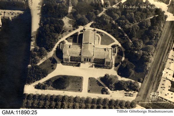 Högskolan från ovan med bostadshus på Götabergsgatan t.v och Aschebergsgatan t.h. Vasaparken bakom.