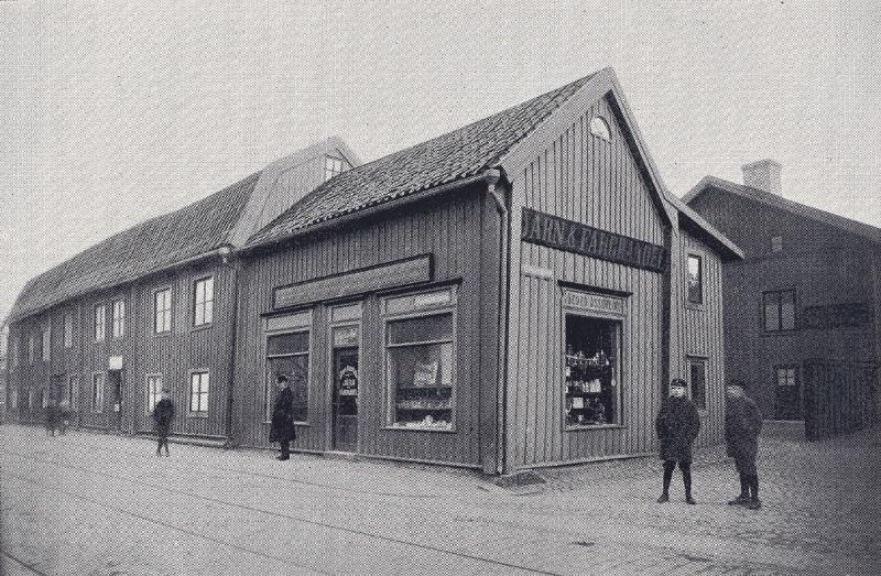 Till vänster: Theodor Nilssons handelsbod, senare Alfred Helgessons och efter honom Birger janssons. Till höger: Asserlinds järnaffär. Rivna för breddning av gatan.