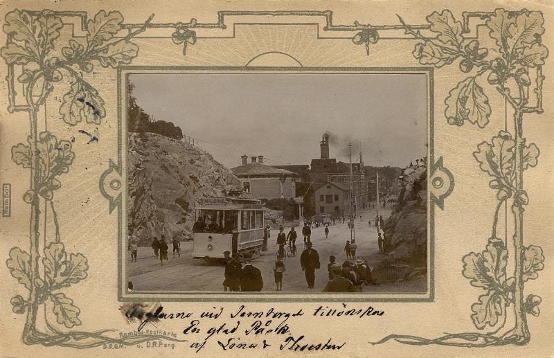 Sträckningsbild av Karl Johansgatan mot öster från Allmänna Vägens västra mynning. i bildens mitt Bryggeriet Kronan.