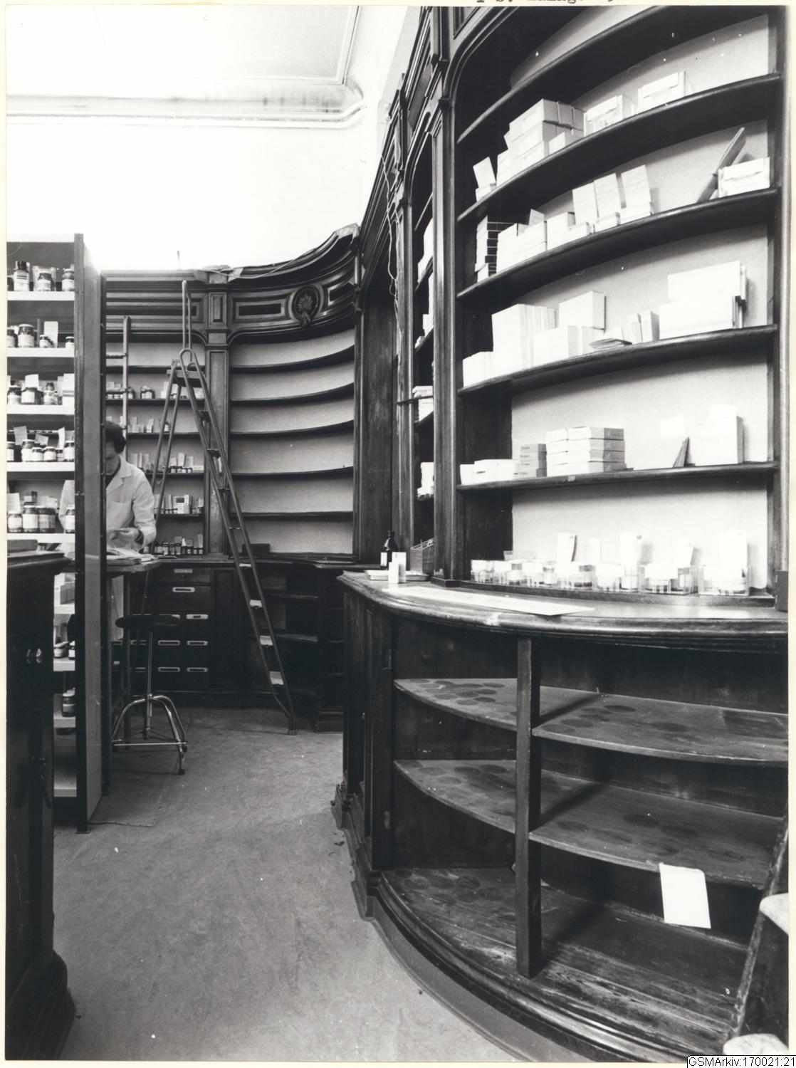 Interiör från apotek Enhörningen med butiksinredning. Fotot taget 1968 innan flytt ur lokalen.