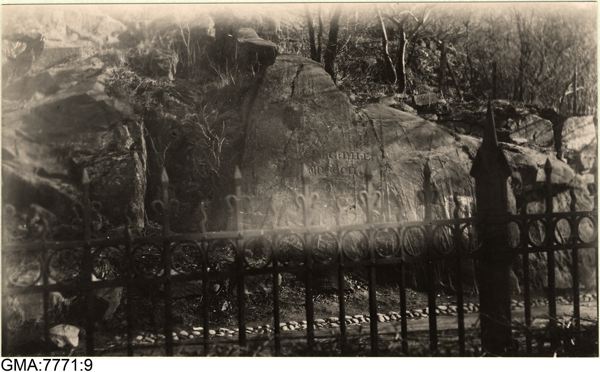 Inskription i bergvägg vid Bangatan. I förgrunden Djurgårdskyrkogårdens staket.