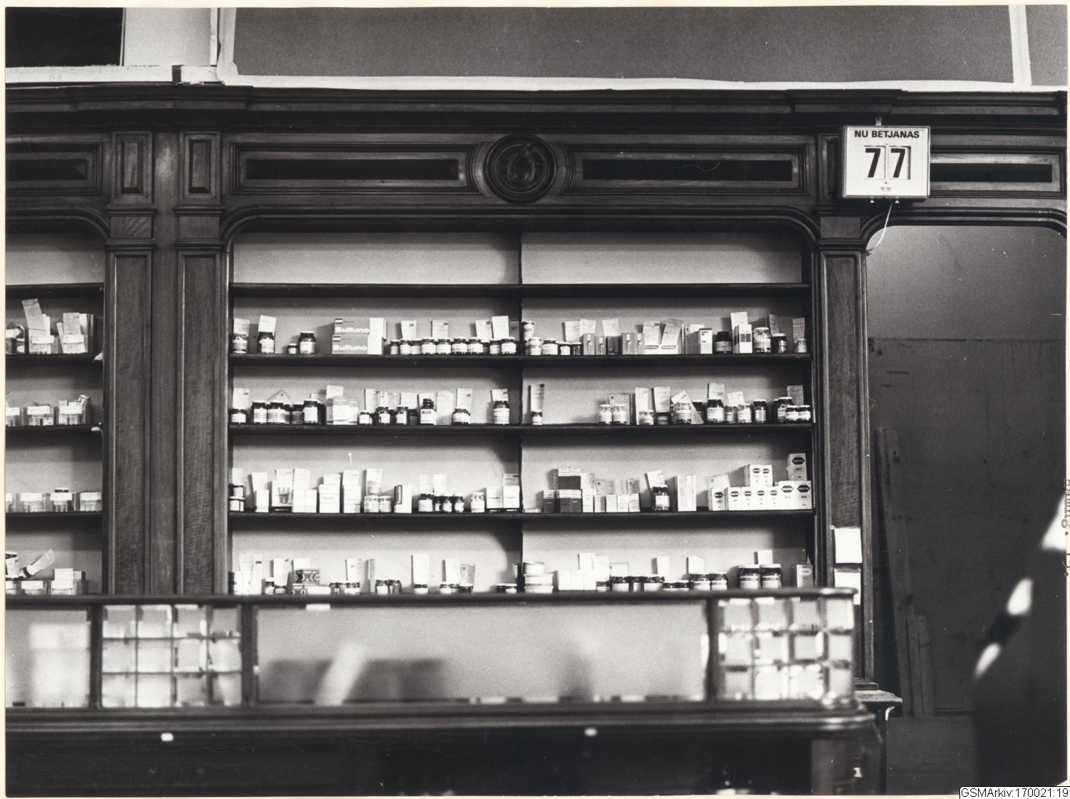 Interiör från apotek Enhörningen med butiksinredning. Fotot taget 1968 innan flytt ur lokalen.
