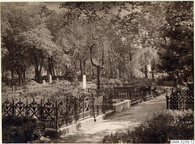 Svartvitt foto, Mariebergs kyrkogård. Kvarter med gravplatser omgärdade med gjujärnstaket.