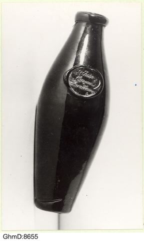 Flaska. Längd 23 cm. Av grönbrunt glas med följande stämpel på skuldran: "Götheborg Brunns Inrättning".