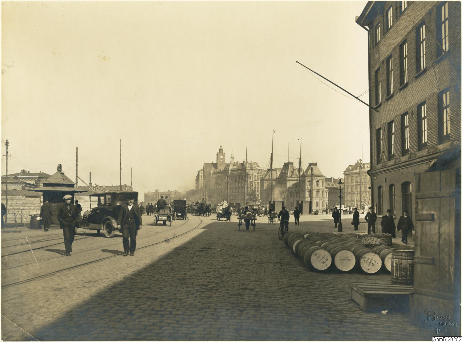 Sträckningsbild från Skeppsbron mot Packhusplatsen, i fonden Centralfängelset. I bildens mitt syns Navigationsskolan på Kvarnberget, ovanför Hertziahuset.