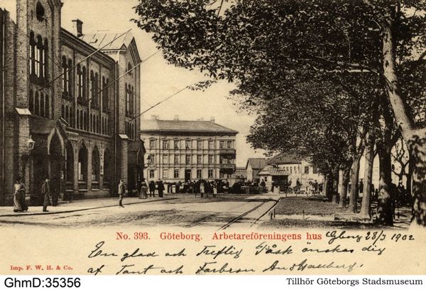Järntorget från Södra Allégatan. Arbetareföreningens hus t.h. Lindbergska huset i bakgrunden.