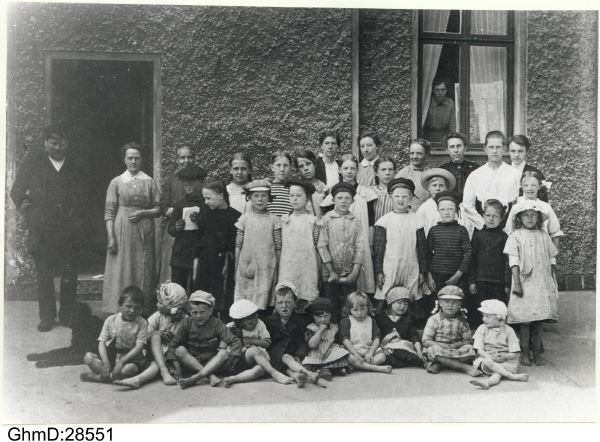 Kvinnor och barn samt längst t.v. herr Persson, kontrollant på Trikinbyrån å Första Långgatan. 1915.