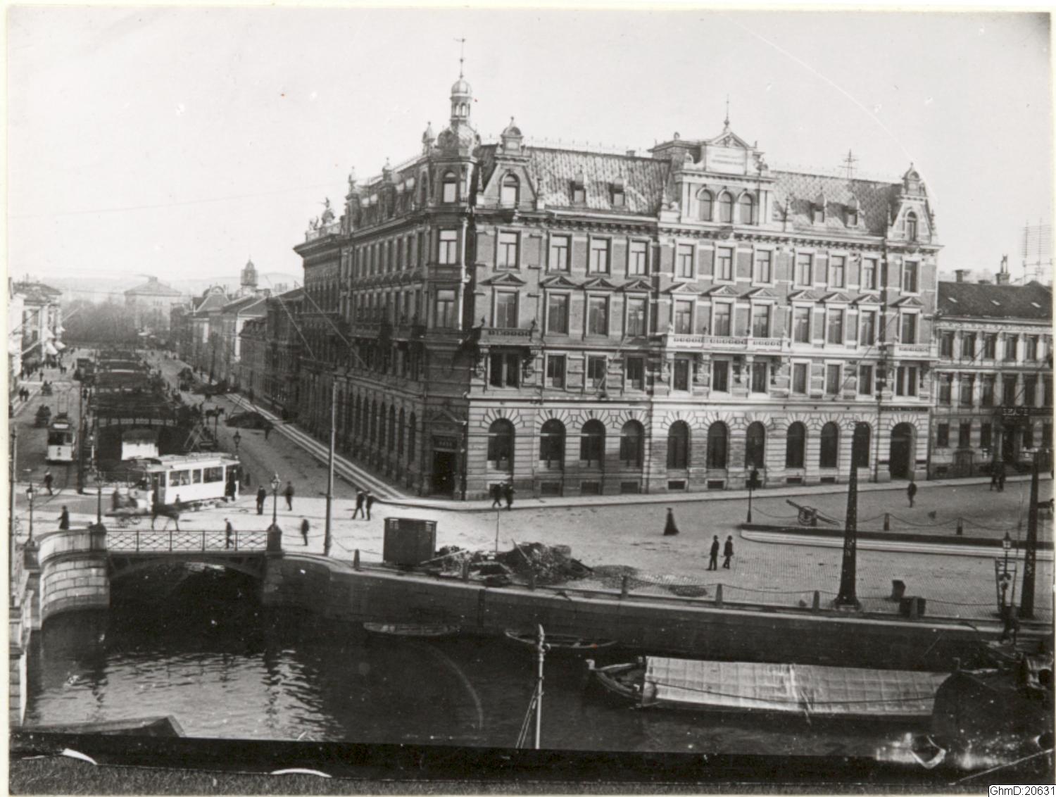 Göteborgs bank vid Västra Hamngatan 1 och Lilla Torget 5- 6. Fotot taget från Norra Hamngatan vid Kämpebron, blick mot söder.