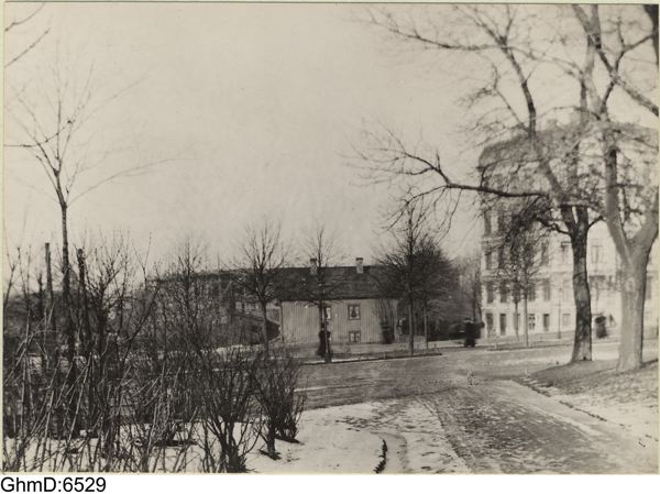 Påskrift med blyerts å baks. av originalfotot: "Omkring 1890/ Vy af "Flygarns haga"/ Plåtslagare Petterssons hus numera Vasaplatsen i Göteborg./ stenhuset är hörnet av Vasagatan 38 och Vasaplatsen 10, uppfört 1884.