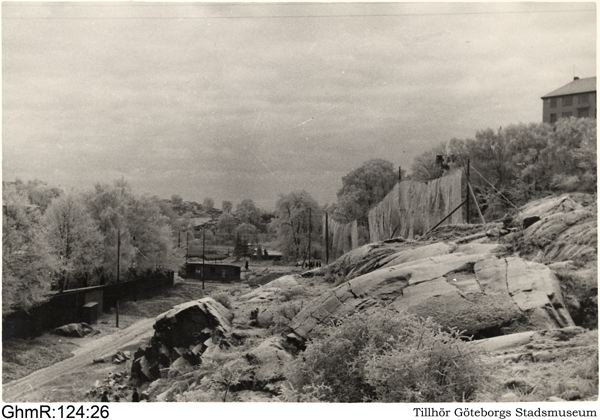 Sprängning för nya vägen Guldhedsgatan och Egnahemsvägens viadukt. Skyddsnät uppsatta för att hindra stenar att slungas ned på Landala Långgata som syns t.v.