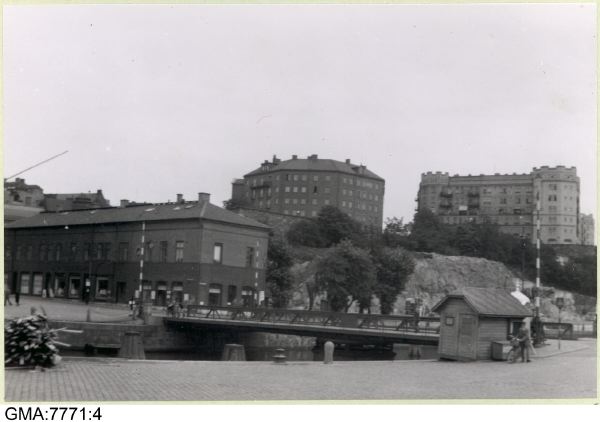 Blick mot bastionen Carolus undecimus Rex från Brogatan. I förgrunden: Pusterviksbron. På höjden: fastigheter vid Arsenals- Hvitfeldtsgatorna.
