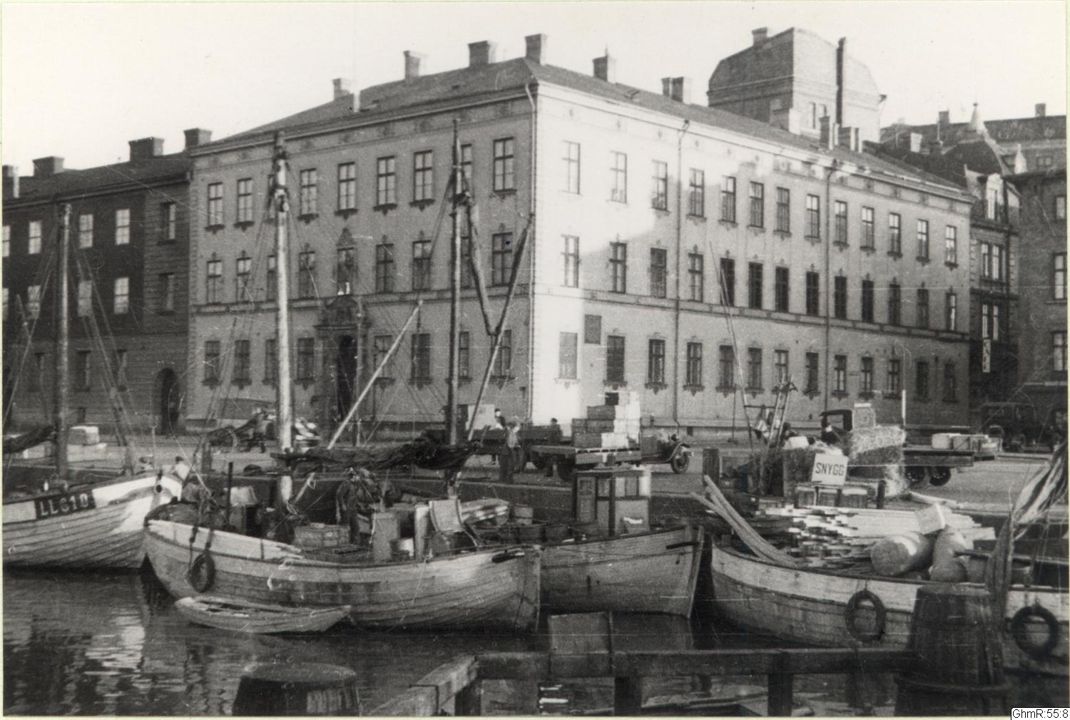 Fiskebåtar i Stora Hamnkanalen vid Stora Bommen och Länsresidenset.
