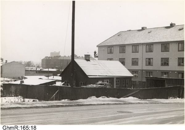Kåk vid Lilla Källhusgatan som skall rivas. Blick från öster.