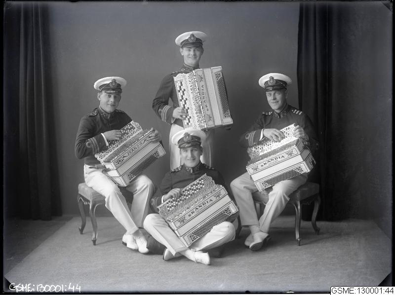 Svartvitt studiofotografi med dragspelskvartetten Bröderna Lindqvist.