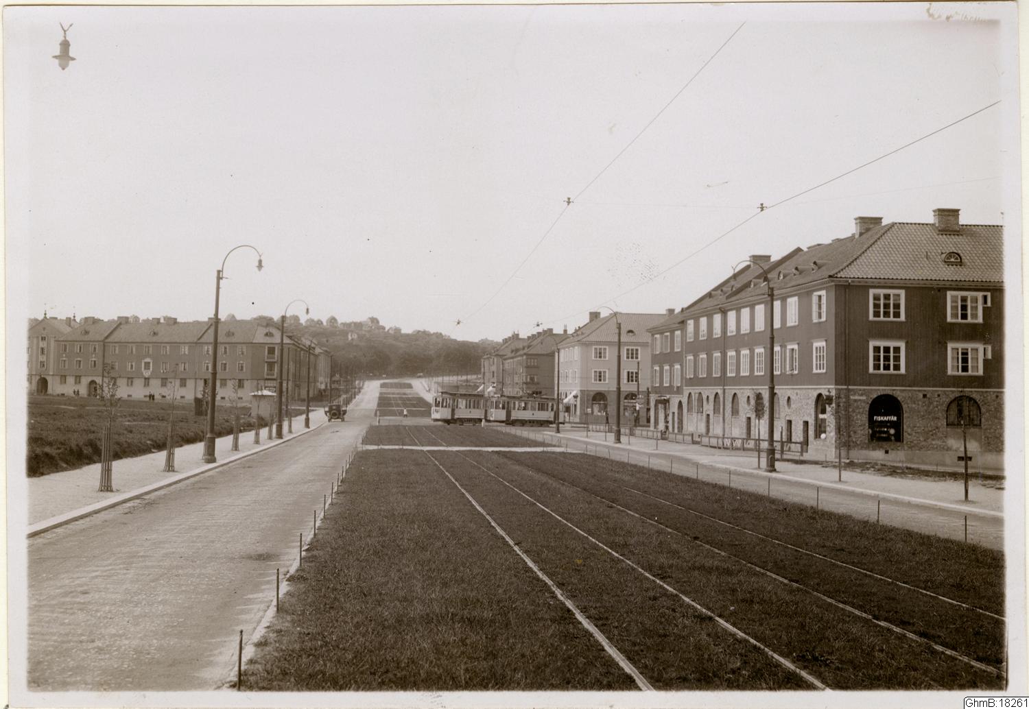 Sträckningsbild med Mariagatan västerut, spårvagnen svänger högert ner på Älvsborgsgatan. Till vänster Stillagatan. Fotot taget i höjd med Svanebäcksgatan, i höger bildkant.
