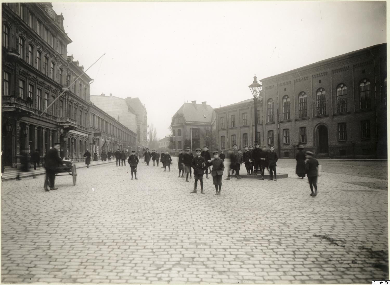 Sträckningsbild över Hvitfeldtsplatsen mot norr, till höger nr 6 Högre latinläroverket/Gamla Latin och nr 4 KFUK