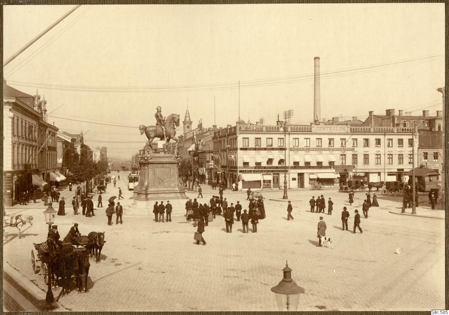 Kungsportsplatsen med Karl IX:s ryttarstaty, Centralen och Östra Hamngatan mot norr.