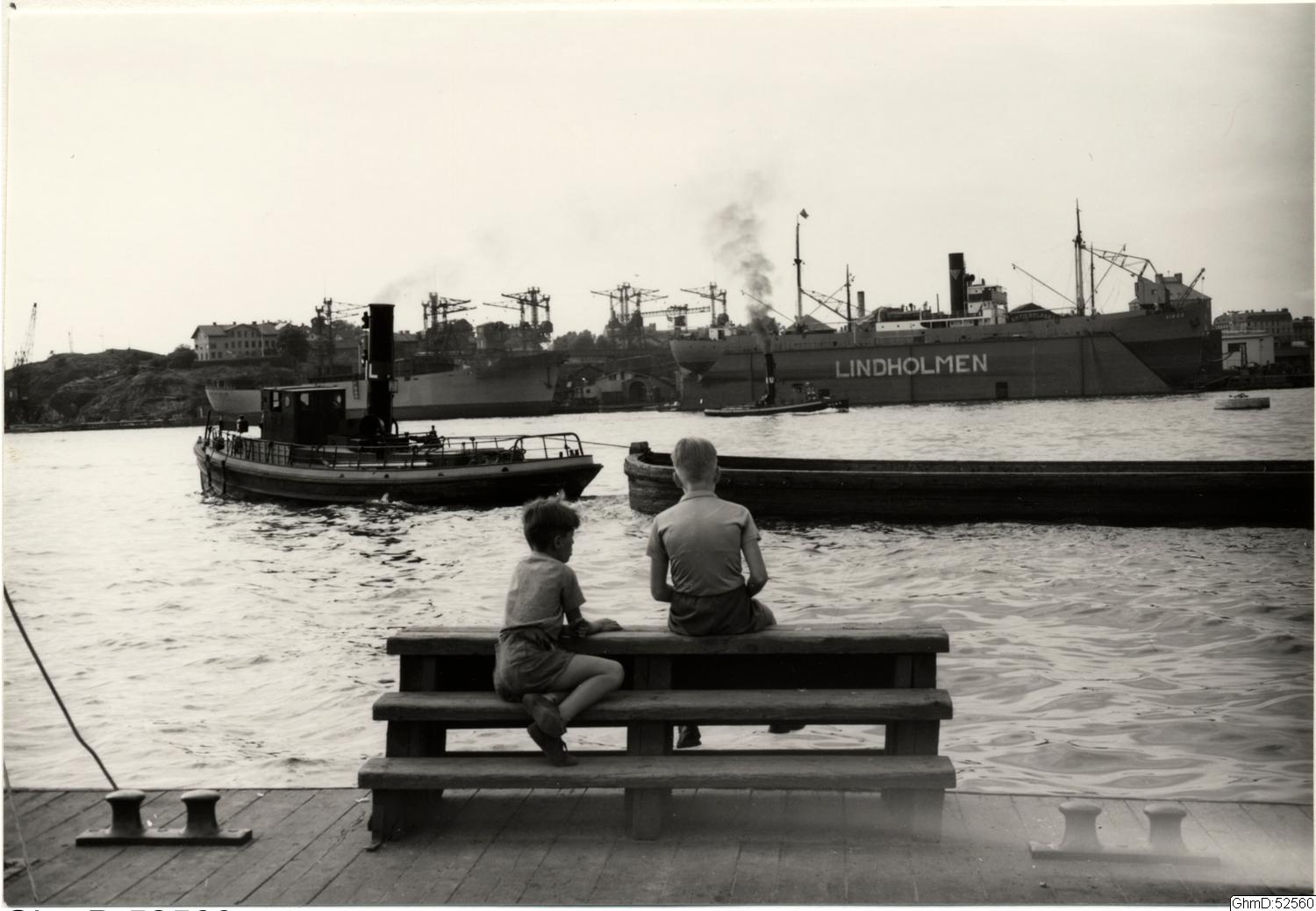 Två pojkar vid Masthuggskajen med utsikt mot Lindholmen. Sol bakom moln, kl. 15:45.