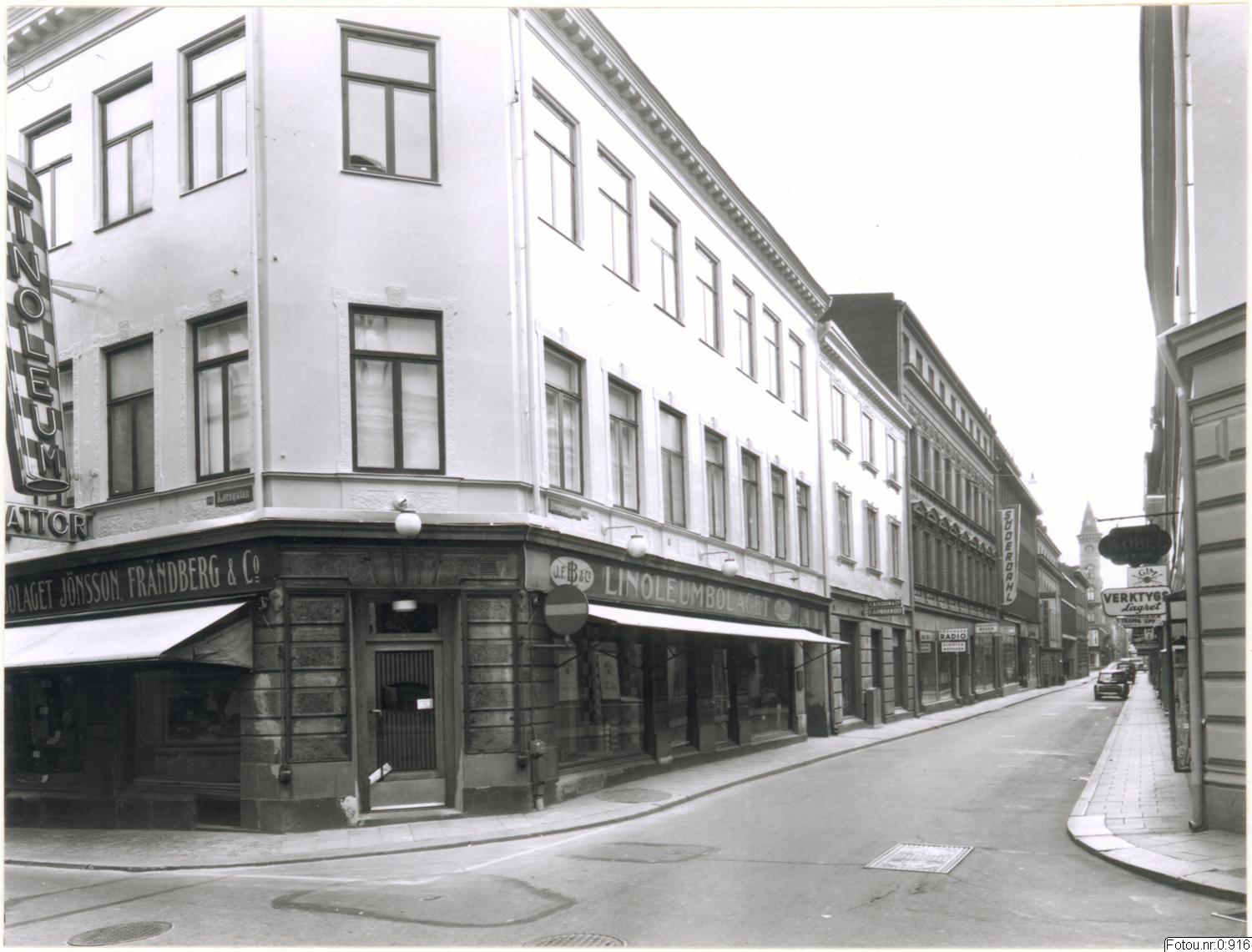 Sträckningsbild Drottninggatan österut. Fotot taget från Korsgatan. I fonden syns torn på arkaden.