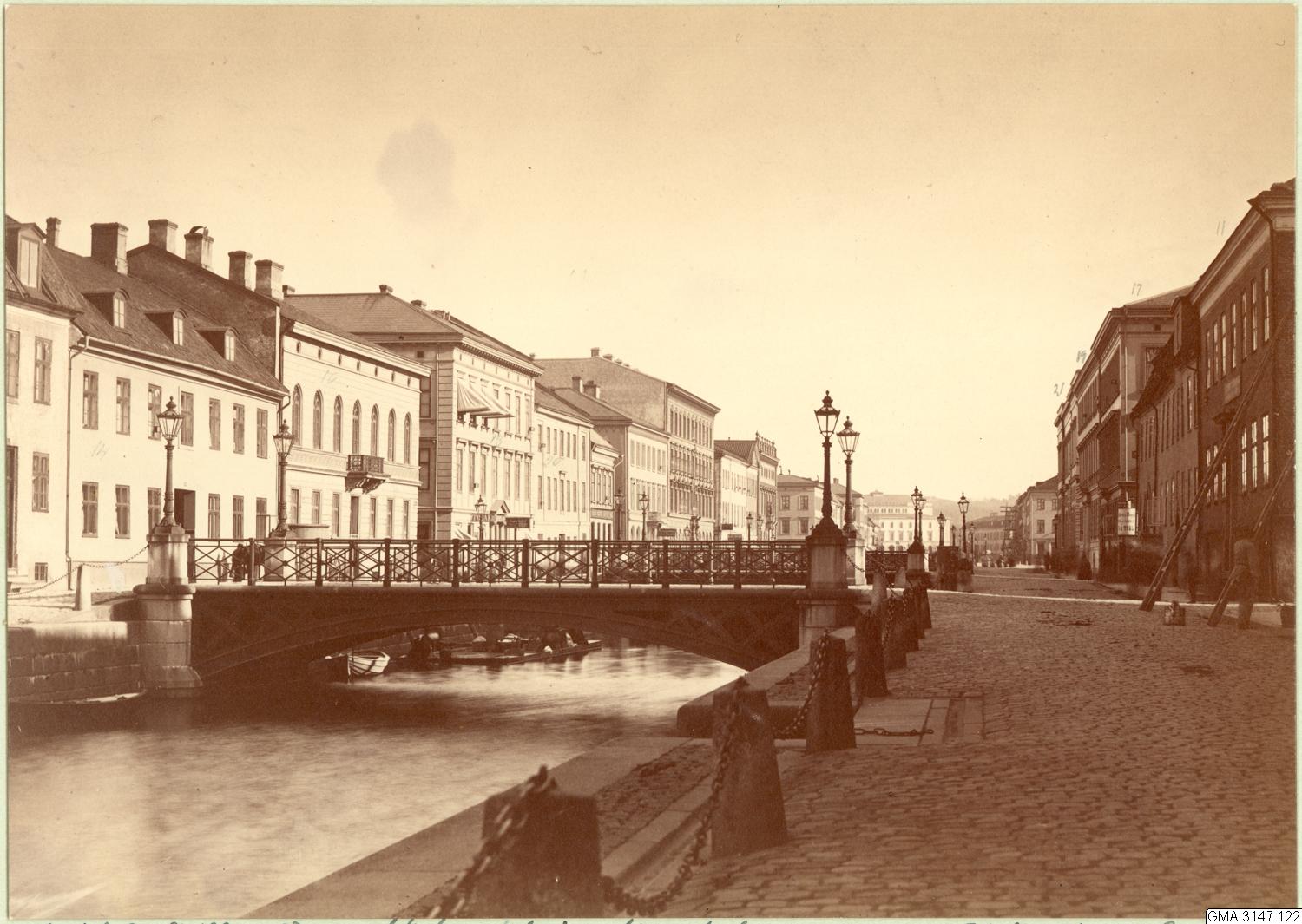 Östra Hamngatan och Östra Hamnkanalen söderut. I fonden Stora teatern. Bilden tagen i höjd med Klädpressargatan.